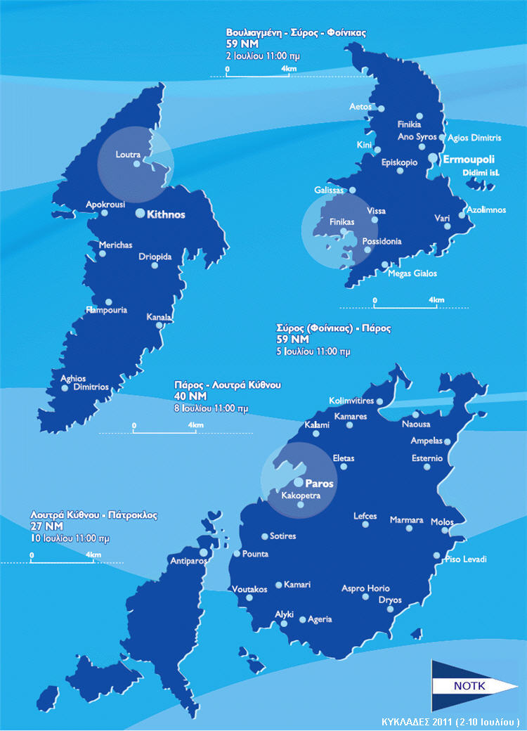 Τα νησιά που θα επισκεφθούμε αυτό το χρόνο είναι η Σύρος (Φοίνικας), η Πάρος (Παροικιά) και η Κύθνος (Λουτρά). Οι τοπικές αρχές, οι σύλλογοι, οι ναυτικοί όμιλοι και οι κάτοικοι των νησιών αυτών, παραδοσιακά μας φιλοξενούν και μας αγκαλιάζουν ζεστά, μας δεξιώνονται και μας γνωρίζουν τις παραδόσεις, τις ομορφιές και τα μνημεία του τόπου τους.
