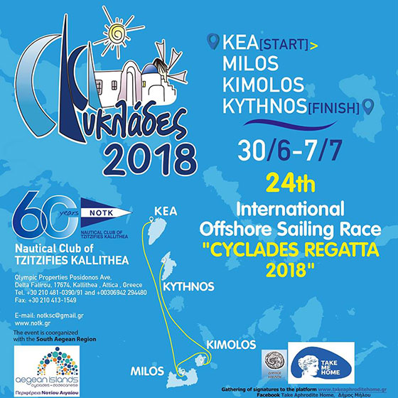- Sunday 01/07/2018 – 11:00: 1st Offshore Race, Kea – Adamas of Milos island, Distance 60 NM