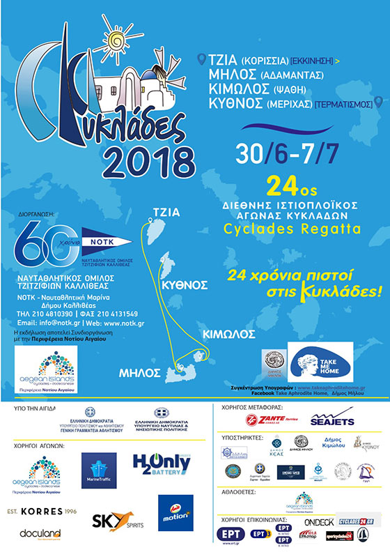 Από τις 30 Ιουνίου έως 7 Ιουλίου 2018 θα πραγματοποιηθεί ο 24ος Διεθνής Ιστιοπλοϊκός Αγώνας ΚΥΚΛΑΔΕΣ 2018 “CYCLADES REGATTA”, ο οποίος εντάσσεται στο επίσημο πρόγραμμα αγώνων Ανοικτής Θάλασσας της Ελληνικής Ιστιοπλοϊκής Ομοσπονδίας (Ε.Ι.Ο.).